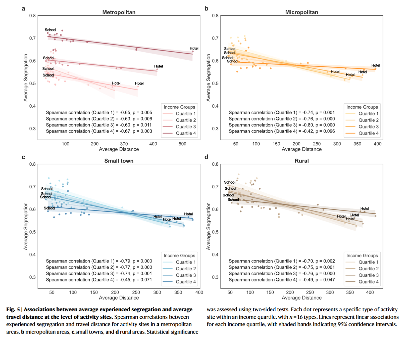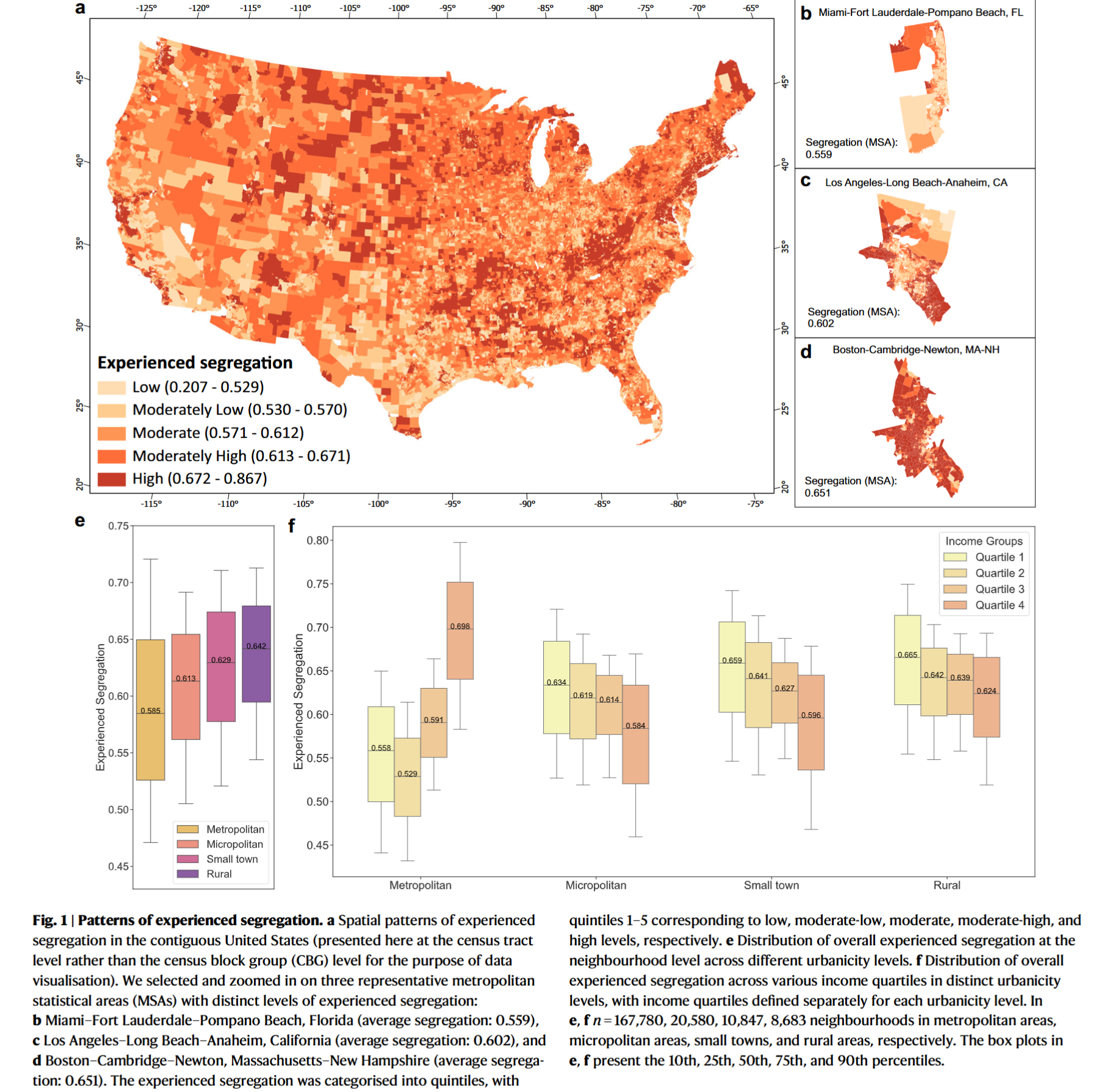 • Leverage a large-scale, neighbourhood-level mobility dataset from the contiguous United States to quantify experienced segregation in activity sites and compare it with residential segregation across neighbourhoods with different social and urban contexts